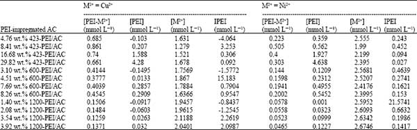 為了進(jìn)一步闡明聚乙烯亞胺浸漬量對活性炭上金屬離子平衡吸附容量的影響,本文計算和比較了PEI浸漬AC上重金屬離子吸附的相互作用參數(shù)(表示為PEI)。應(yīng)該指出的是,I PEI不等于絡(luò)合常數(shù),只計算比較重金屬和PEI浸漬的活性炭表面之間的相互作用程度。